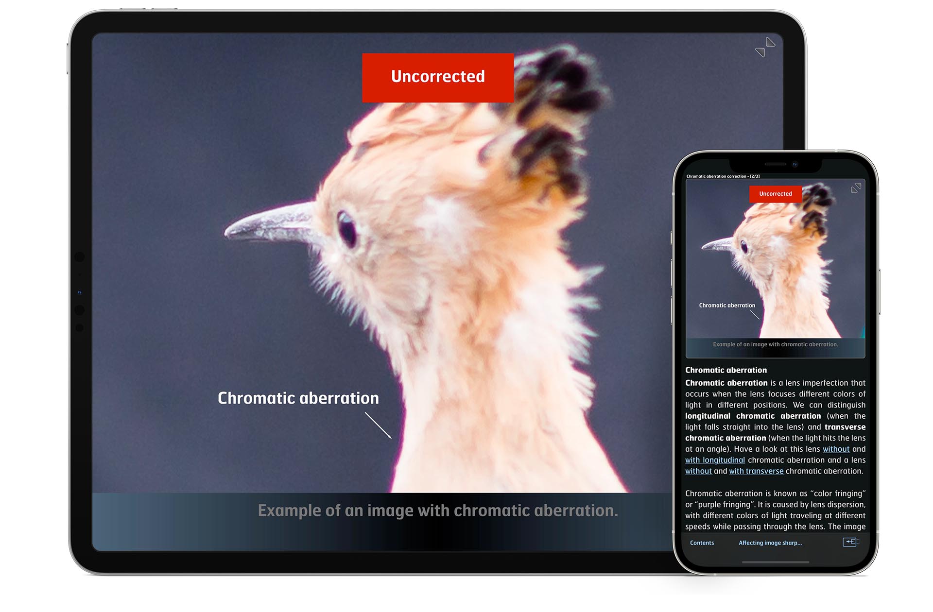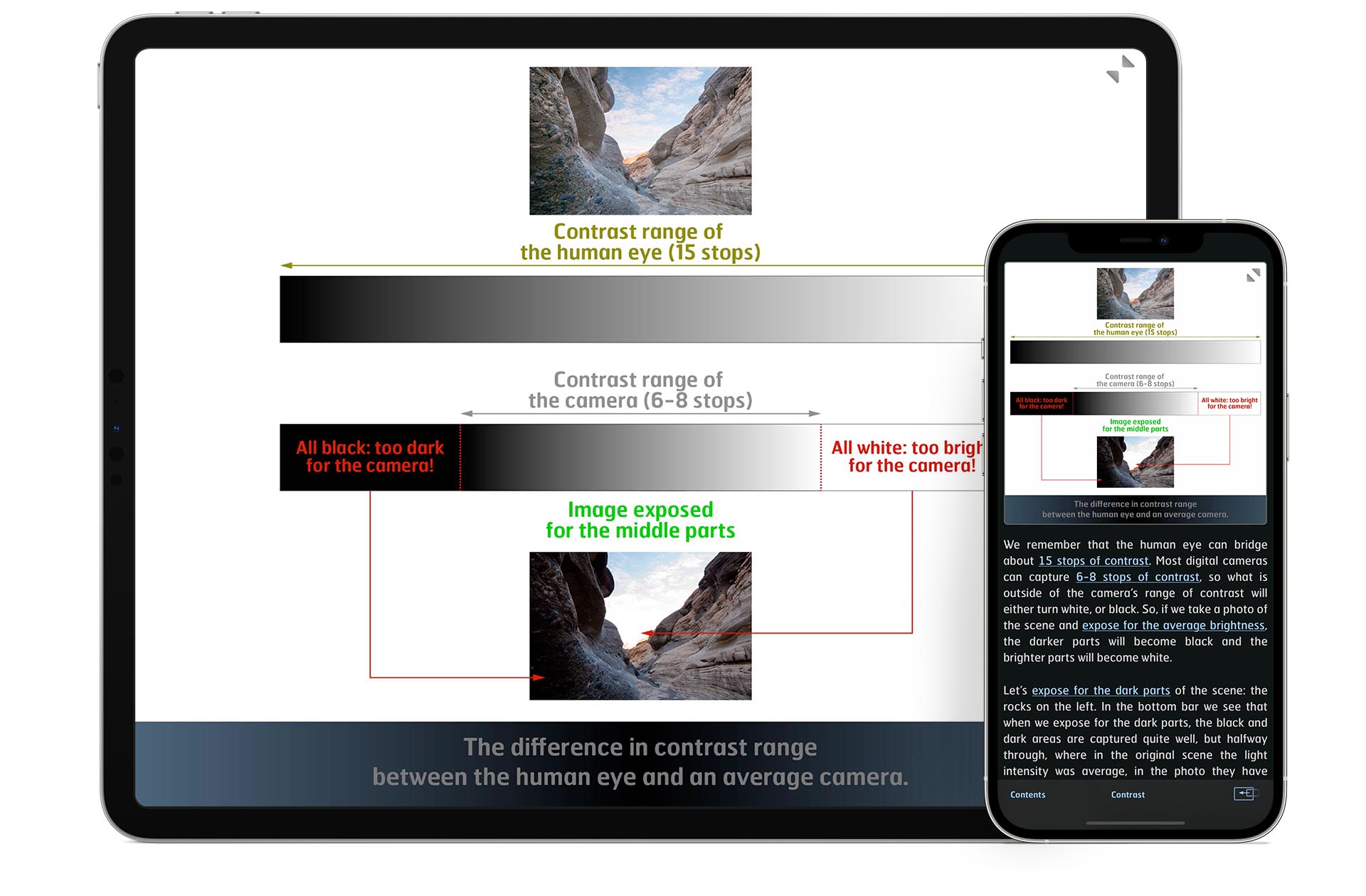 Every illustration, photo and animation available in high quality for detailed full-screen studying.